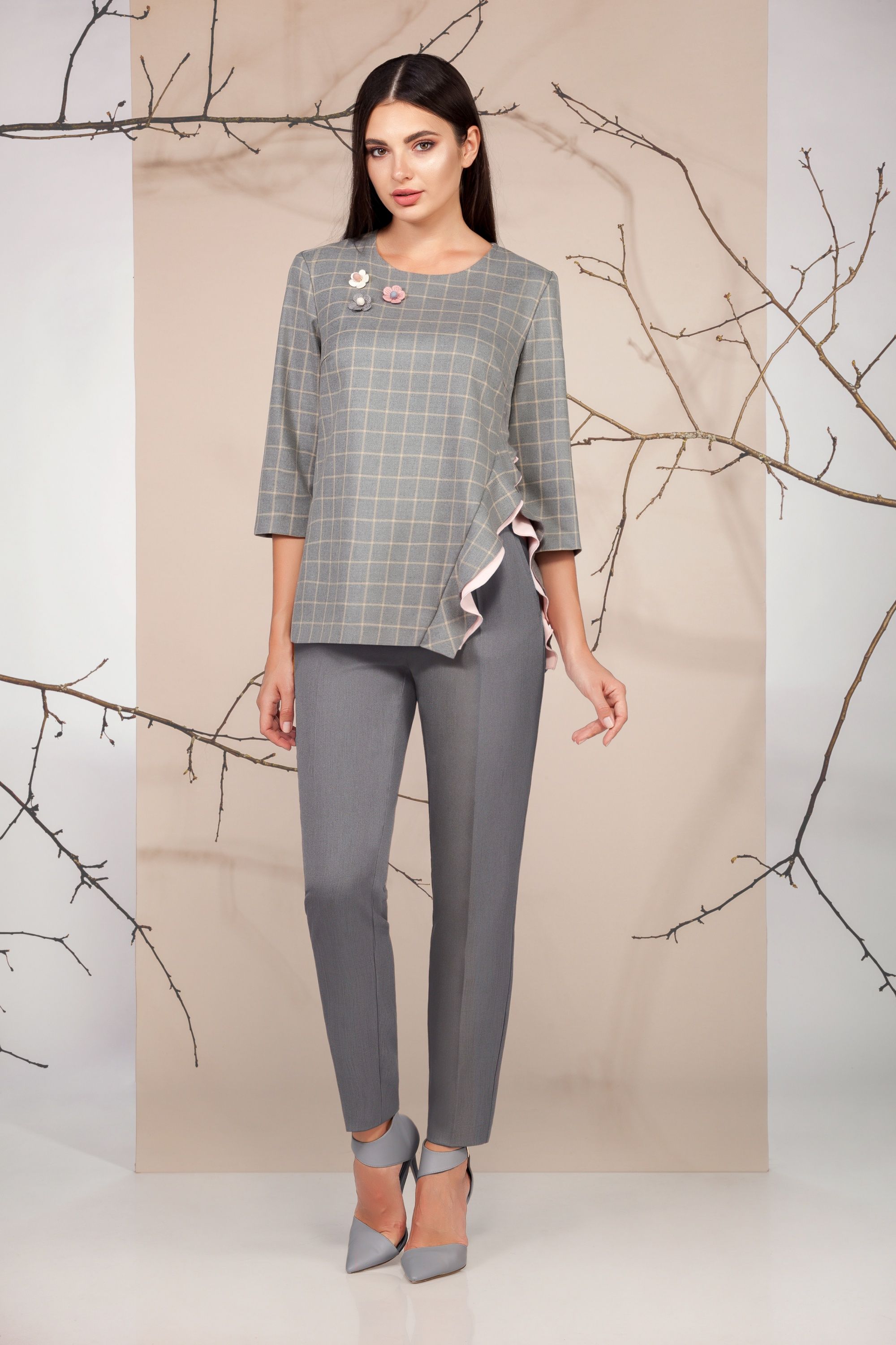 - Blouse – viscose 86%, elastane 14%. Trousers – polyester 95%, elastane 5%