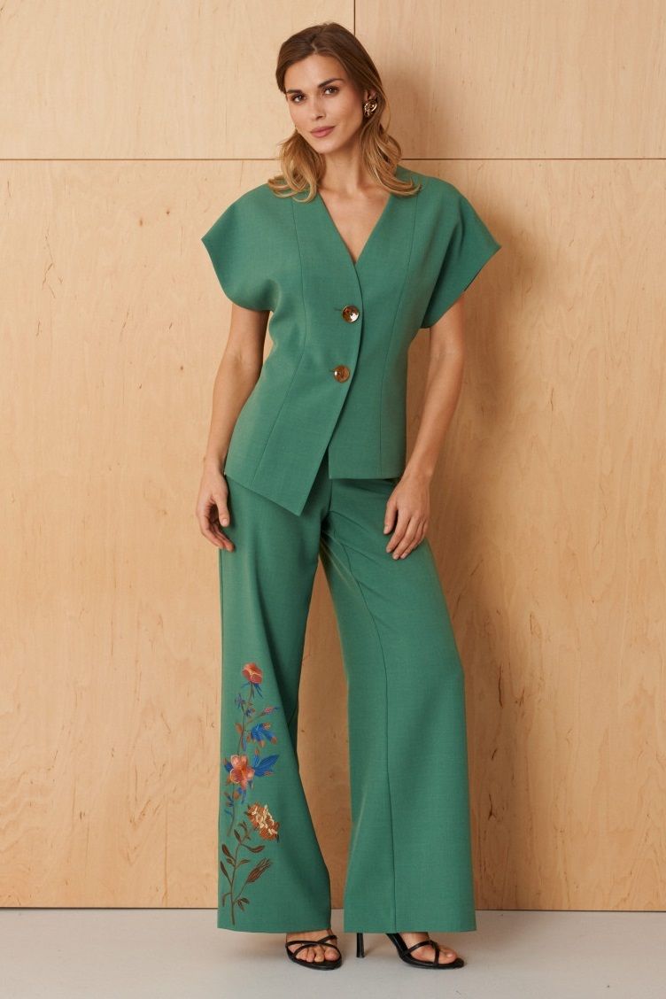 | 54 | Жакет: Длина изделия - 59.5см, Ширина плеча - 28см, Ширина по груди - 56см, Ширина по низу - 60.5см, Ширина рукава - 26.5см; Брюки: Высота посадки - 29.5см, Длина брюк без пояса - 106.5см, Длина по внутреннему шву - 83.5см, Ширина брючин сверху - 77.5см, Обхват брюк по низу - 67см, Ширина по бедрам - 59.5см, Ширина по талии - 49.5см; |