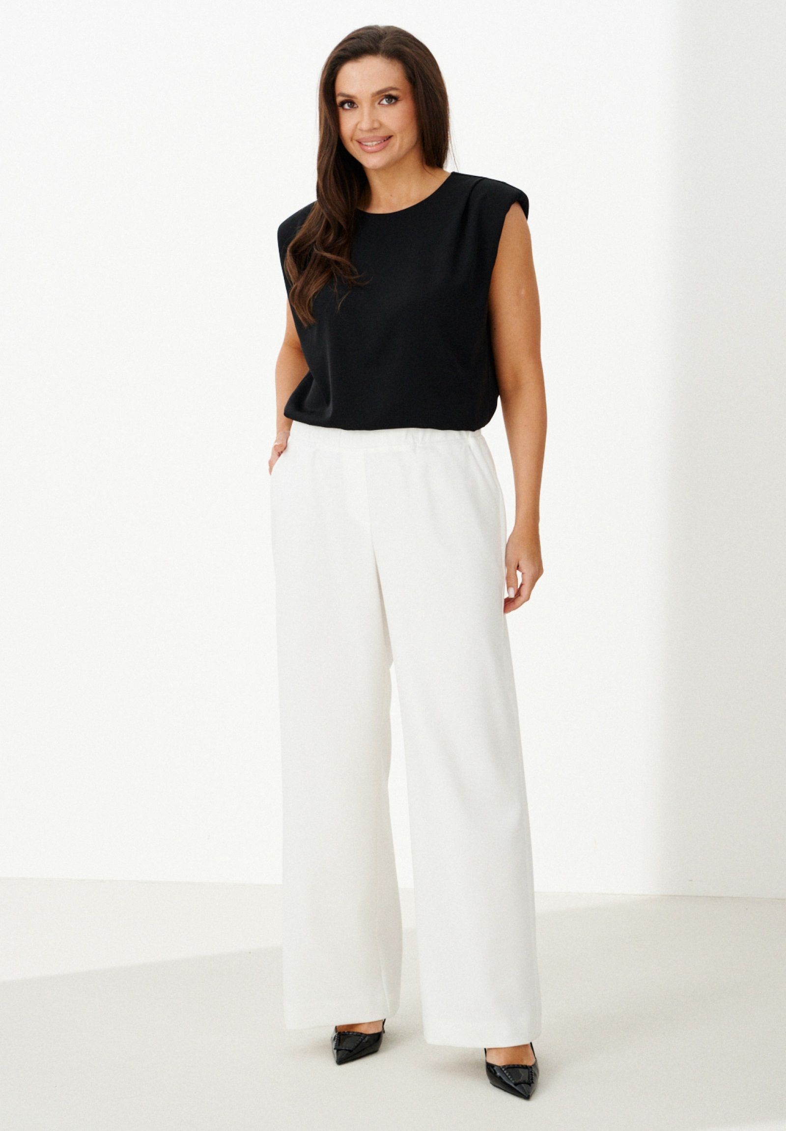| 44 | Брюки: Высота посадки - 28см, Длина брюк с поясом - 110см, Длина по внутреннему шву - 81.5см, Ширина брючин сверху - 64см, Обхват брюк по низу - 59см, Ширина по бедрам - 33см, Ширина по талии - 53см; |